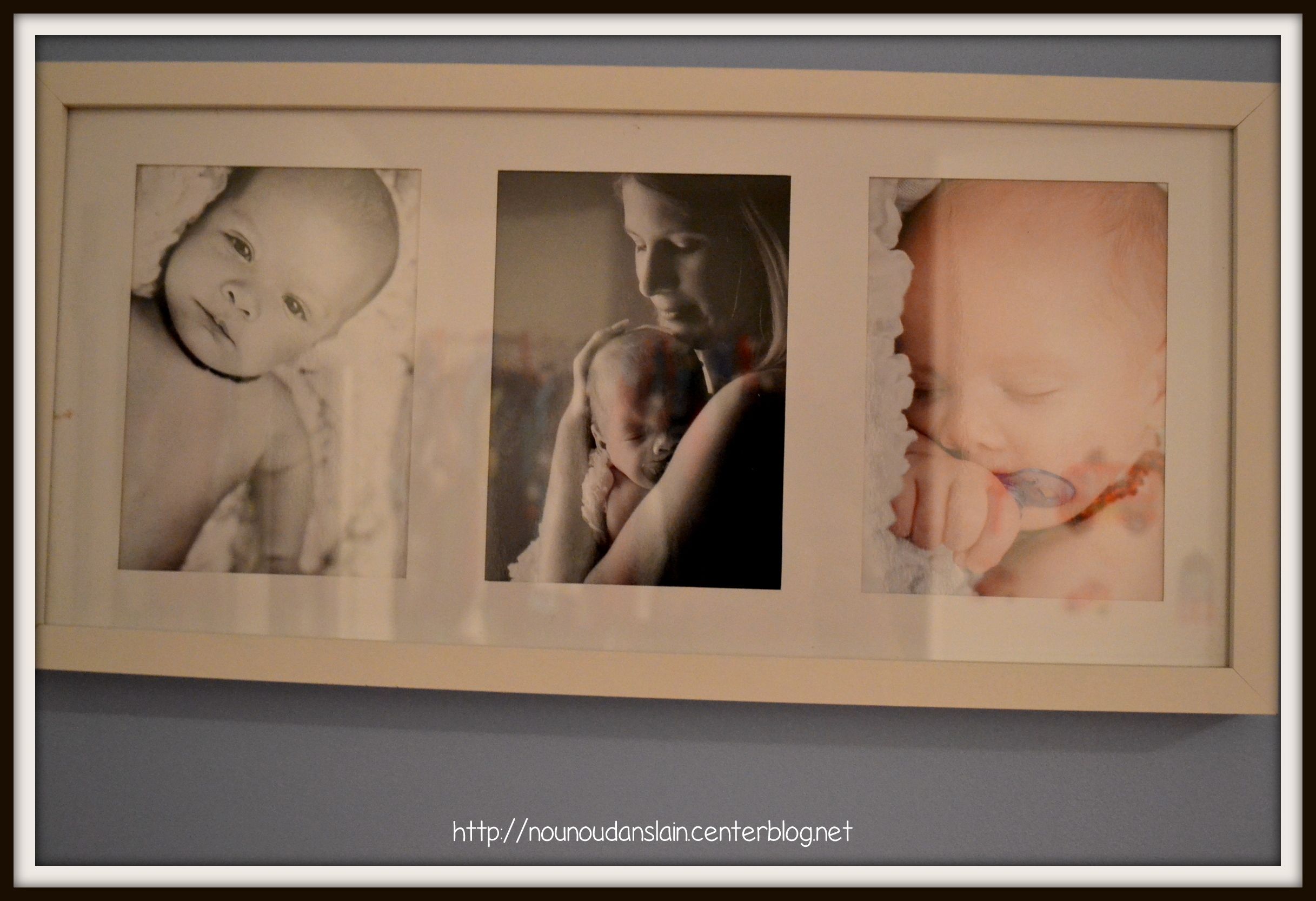 J'ai choisi ce cadre, tout simplement ce sont des photos que j'avais fait faire par un photographe quand mon fils avait 3 mois car tout simplement il n'a pas eu la chance d'avoir les photos de maternité (car né prématuré) mais d'un côté j'ai été contente de louper ça pour ne pas avoir payer un bras ces photos! Mais tout ça pour dire que j'adore contempler ce cadre chaque soir quand je le couche!!!